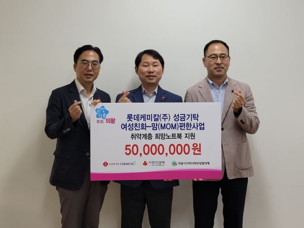 이날 롯데케미칼이 전달한 기부금은 ‘의왕시 여성친화-맘편한 사업’의 일환으로 한부모가정 및 차상위 가정 자녀들을 위한 노트북 등 교육 기자재 지원에 사용될 예정이다.
