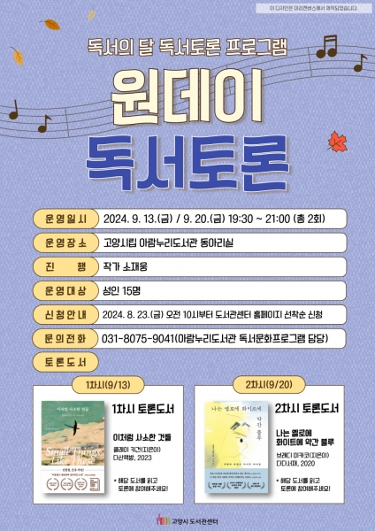 [금요저널] 고양특례시 아람누리도서관은 9월 독서의 달을 맞아 오는 9월 13일부터 ‘원데이 독서토론’ 프로그램을 운영한다고 밝혔다.