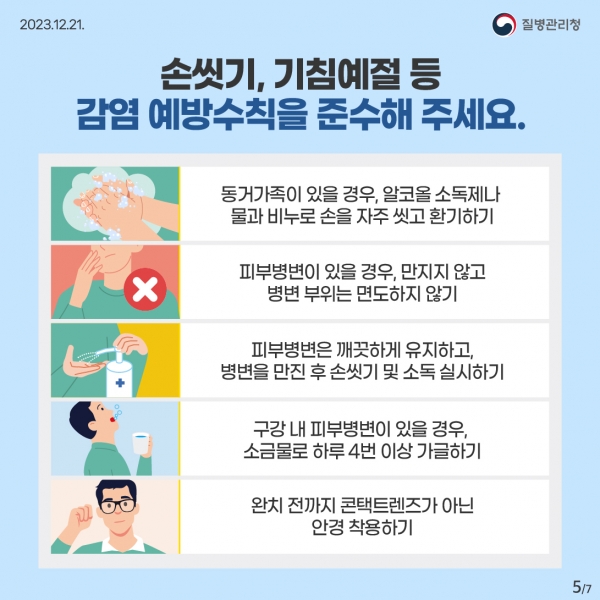 또한, 오염된 손으로 점막 부위를 만지지 말고 손씻기 등 개인위생 수칙을 준수해야 한다.
