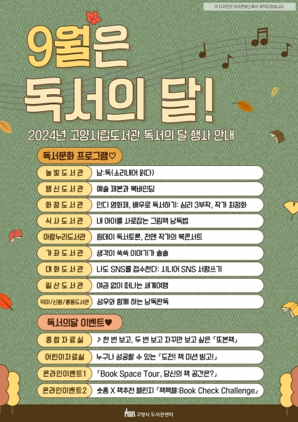 [금요저널] 고양특례시는 9월 독서의 달을 맞아, 시민의 독서문화 확산에 기여하기 위해 다양한 독서문화프로그램을 운영한다고 밝혔다.
