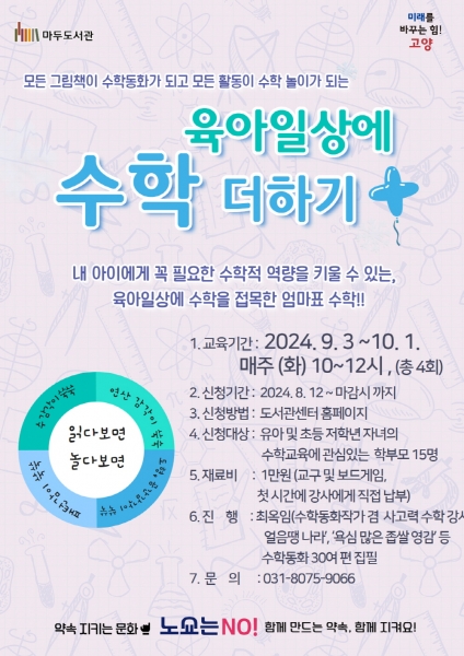 [금요저널] 고양특례시 마두도서관에서는 오는 9월 3일부터 모든 그림책이 수학동화가 되고 모든 활동이 수학 놀이가 되는 ‘육아일상에 수학 더하기"를 운영한다.
