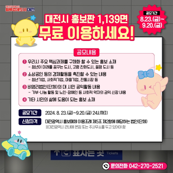 [금요저널] 대전시는 8월 23일부터 9월 20일까지 시 보유 홍보 매체를 무료로 이용할 업체를 공개 모집한다.
