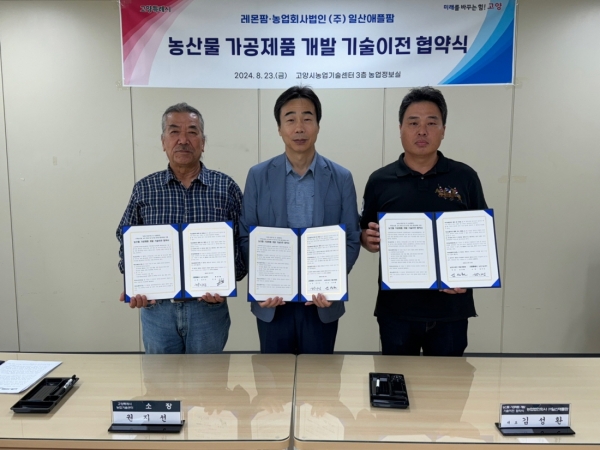 [금요저널] 고양특례시는 8월 23일 고양시농업기술센터 농업정보실에서 식품제조가공업체인 레몬팜, ㈜ 일산애플팜과 기술이전 협약식을 개최했다.