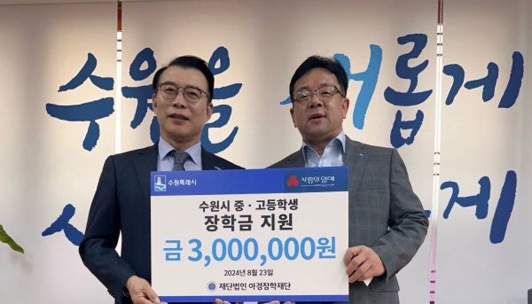 아경장학재단은 지난해 9월에도 수원시에 취약계층 중·고등학생을 위한 장학금 300만원을 기탁한 바 있다.