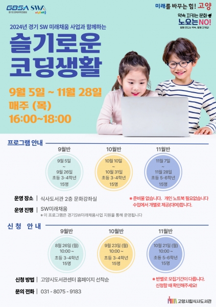 [금요저널] 고양특례시 식사도서관이 오는 9월 5일부터 경기SW미래채움과 함께 ‘슬기로운 코딩생활’을 운영한다고 밝혔다.