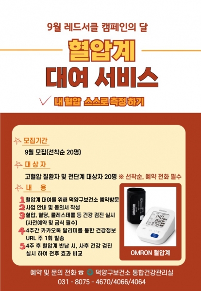 이에 덕양구보건소는 9월 레드서클 캠페인의 달을 맞이해 고혈압 질환자와 전 단계 대상자가 가정에서 꾸준히 혈압을 자가 측정해 스스로 관리할 수 있는 여건을 조성하기 위해 혈압계 무료 대여사업을 실시한다.