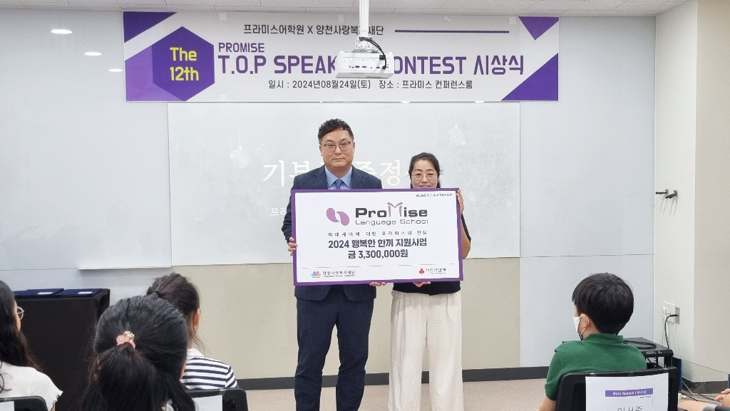㈜프라미스에듀 프라미스어학원(대표 홍현민)은 지난 24일 학원에서 결식우려아동을 위한 기금 330만원과 학원생들이 직접 후원한 기부식품 전달식을 진행했다.