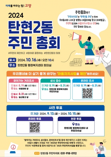 박점홍 탄현2동 주민자치회장은 "주민 참여는 주민자치 사업의 필수 요소이므로 주민들과 함께 마을의 현안을 발굴하고 소통하며 해결해 가는 과정을 통해 진정한 의미의 주민자치를 실현할 것으로 기대된다”고 전했다.