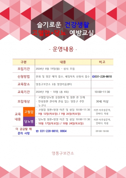 영통구보건소에서 열리며 고혈압 교육은 9월 12·26일 당뇨병 교육은 10월 17·24일 오전 10시부터 11시 30분까지 진행된다.
