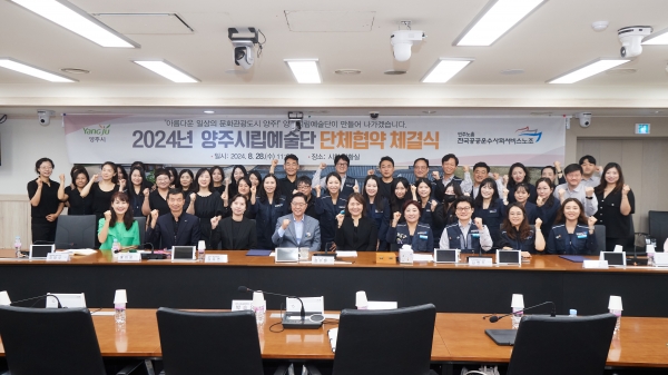 [금요저널] 양주시는 28일 시청 2층 상황실에서 민주노총 전국공공운수노조 양주시립예술단지회와 단체교섭 협약을 체결하고 1층 로비에서 체결 기념 음악회를 개최했다고 밝혔다.
