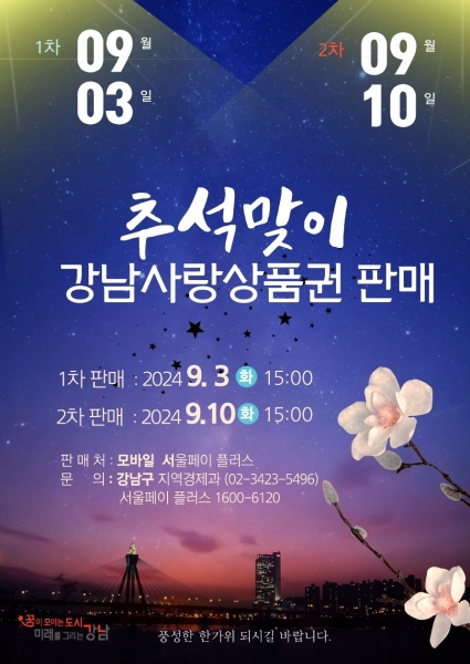 [금요저널] 꿈이 모이는 도시, 미래를 그리는 강남구가 한가위를 맞아 9월 3일과 10일 오후 3시 두 차례에 걸쳐 강남사랑상품권 300억원을 발행한다.