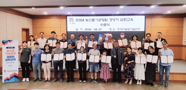 교육생은 2023년 농산물가공창업 경영자 기초교육 수료생 중 교육신청서와 농산물가공제품 사업계획서를 기준으로 선발했다.