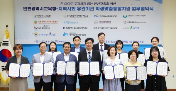 [금요저널] 인천광역시교육청은 학생 중심의 맞춤형 통합지원을 위해 인천사회서비스원, 사회복지협의회, 사회복지사협회, 사회복지관협회 등 13개 지역사회 사회복지 및 아동·청소년 전문기관과 ‘학생맞춤통합지원 업무협약’을 29일 체결했다.