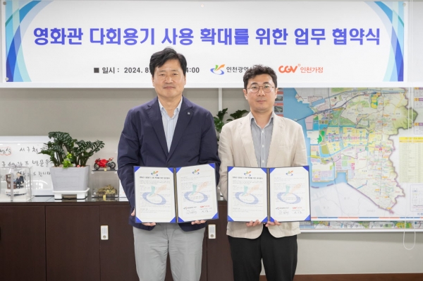 [금요저널] 인천 서구는 지난 28일 CGV인천가정과 함께 ‘영화관 다회용기 사용 확대를 위한 업무협약’을 체결했다고 밝혔다.