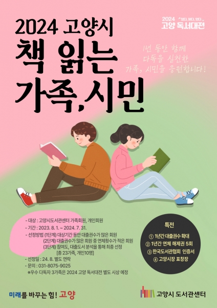 [금요저널] 고양특례시는 가정에서부터 책 읽는 문화를 확산시키고 독서의 생활화를 권장하기 위해 ‘2024년 고양시 책 읽는 가족과 시민'을 선정할 계획이라고 30일 밝혔다.