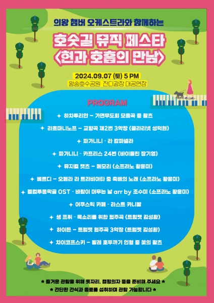 [금요저널] 의왕 챔버 오케스트라 는 9월 7일 오후 5시 의왕 왕송호수공원 잔디광장에서 클래식 연주회 ‘호숫길 뮤직 페스타 2 – 현과 호흡의 만남’을 개최한다고 밝혔다.