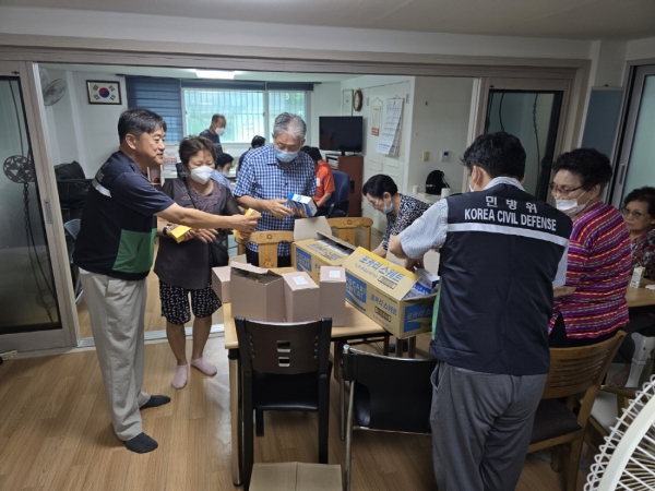 이날 어르신들의 안부를 확인하면서 △자외선 차단제 △이온섭취용 음료 △쿨패치 등 폭염 대응 안전물품 각 100개를 배부했다.