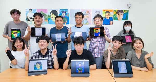 수원시 고향사랑기금 활용 사업으로 진행 중인 호매실장애인종합복지관 디지털 드로잉 작가 양성 교육 참여자 등 관계자들이 작품이 담긴 태블릿을 들고 기념촬영을 하고 있다.