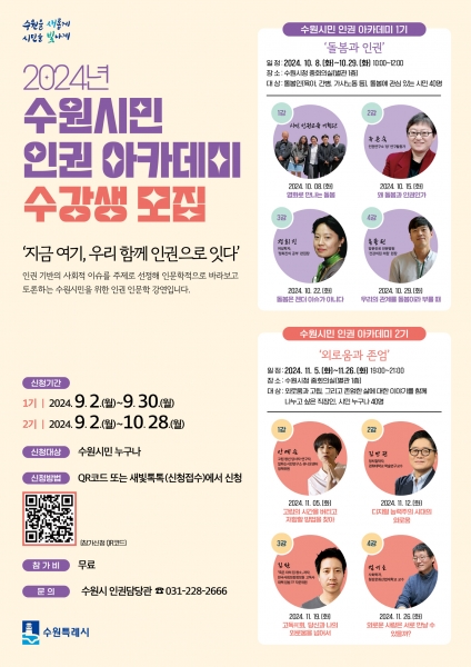 ‘지금 여기, 우리 함께 인권으로 잇다’를 주제로 하는 수원시민 인권 아카데미는 1기 ‘돌봄과 인권’, 2기 ‘외로움과 존엄’ 과정으로 이뤄진다.