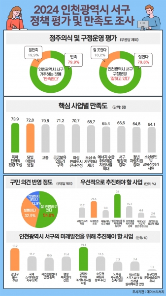 그 결과 인천광역시 서구에 거주하는 것에 ‘만족한다’라는 답변이 79.9%를 차지했으며 서구의 핵심 사업에 대한 종합 평균 만족도는 66.3%로 만족스러운 수준으로 나타났다.