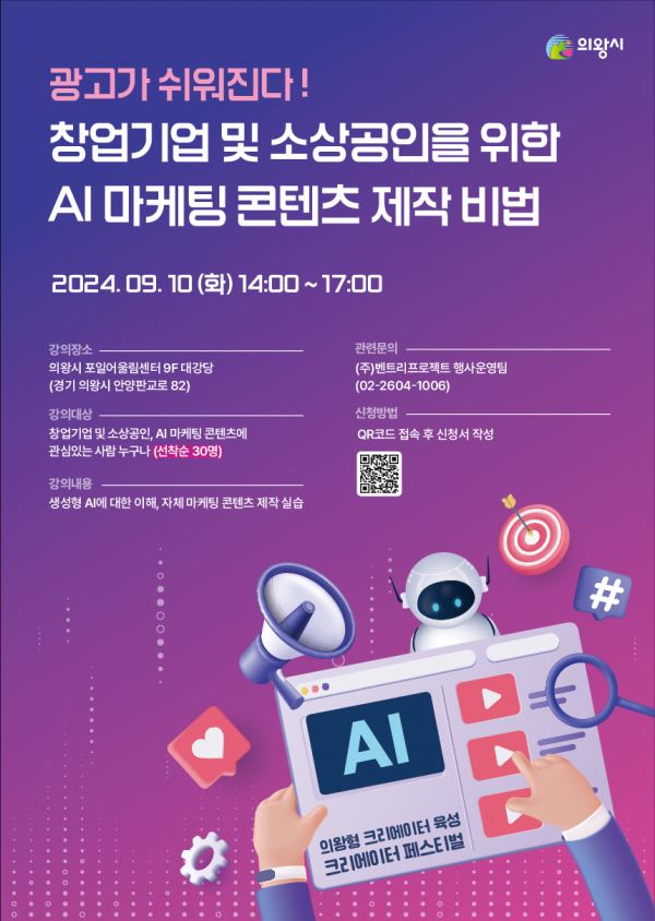 크리에이터 페스티벌은 오는 10일 오후 2시부터 의왕시 포일어울림센터 9층 대강당에서 진행되며 관내 창업기업과 소상공인은 물론, 생성형AI를 활용한 콘텐츠 제작에 관심 있는 누구나 신청할 수 있다.