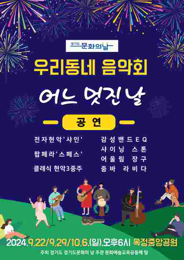 [금요저널] 양주시 문화예술교육동동체 탐은 오는 9월 22일 29일 10월 6일 총 3일에 걸쳐 옥정호수공원 야외공연장에서 ‘2024 경기도 문화의 날’ ‘우리동네 음악회 ‘어느 멋진 날’’을 개최한다고 밝혔다.