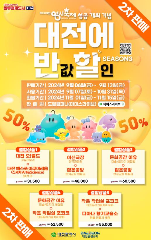 노기수 대전시 문화예술관광국장은 “이번 반값할인 결합상품 2차 판매는 200만 관람객이 방문한 대전 0시 축제 성공개최를 기념하고 지난 1차 판매에서 구매하지 못한 많은 관광객의 요청에 따라 진행하게 됐다”며 “앞으로 꿀잼대전에서 더 재미있고 매력적인 경험을 하시길 바란다”고 말했다.