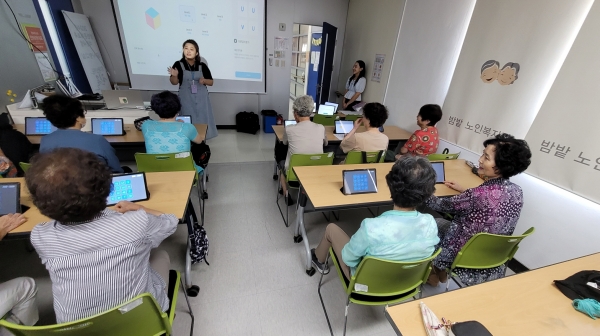 밤밭노인복지관에서 어르신들에게 치매예방교실을 운영하고 있다.