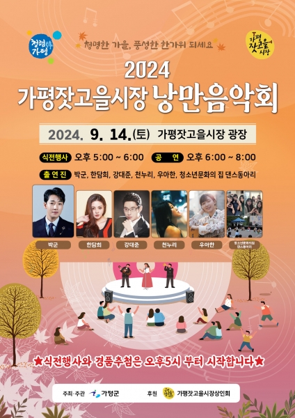 [금요저널] 추석 대명절을 앞두고 ‘2024년 가평잣고을시장 낭만음악회’ 가 14일 가평잣고을광장에서 개최된다.