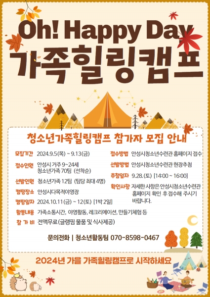 조인호 안성시청소년수련관장은 “이번 가족힐링캠프는 일상의 스트레스에서 벗어나 자연 속에서 가족이 함께 의미 있는 시간을 보낼 수 있도록 기획됐다” 며 “많은 가족들이 이 캠프를 통해 서로에게 더 가까워지고 즐거운 추억을 쌓을 수 있기를 바란다”고 말했다.
