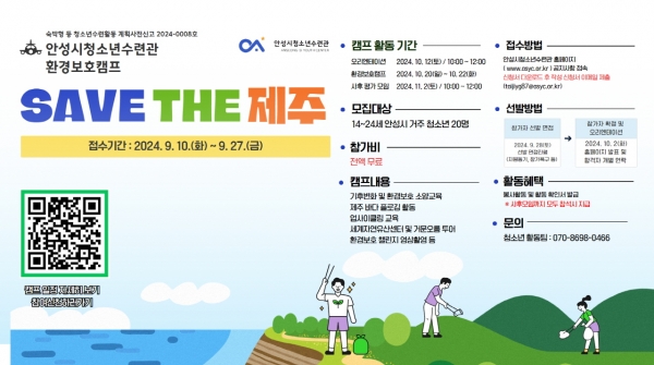 [금요저널] 안성시청소년수련관에서는 9월 10일 화요일부터 안성시 관내 중·고·대학생을 대상으로 환경보호캠프 ‘SAVE THE 제주’ 참가자를 모집한다.