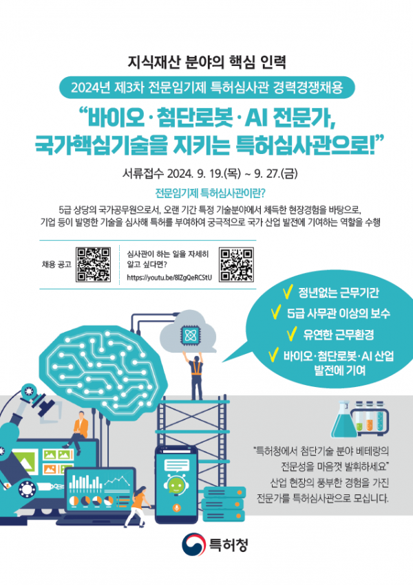한편 특허청은 민간 기업 및 기술인력들에 대한 채용 홍보를 위해 9. 12. ‘2024 K-ICT WEEK in BUSAN’ 행사장에서 채용 설명회를 개최한다.
