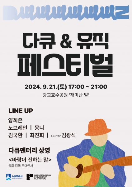 [금요저널] 수원시가 DMZ국제다큐멘터리영화제와 함께 준비한 ‘다큐 &뮤직 페스티벌’ 이 9월 21일 오후 5시 광교호수공원 재미난 밭에서 열린다.
