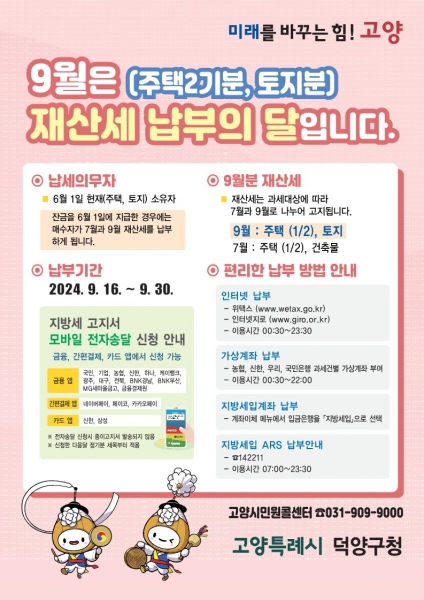 [금요저널] 고양특례시 덕양구는 2024년도 9월 정기분 재산세 882억원을 부과했다고 밝혔다.