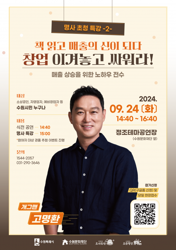 문화체육부 공모사업인 수원시 계획공모형 지역관광개발사업의 일환으로 추진하는 이번 특강은 연 매출 10억원을 기록한 성공 창업가이자 베스트셀러 작가인 방송인 고명환 대표가 강연자로 나선다.