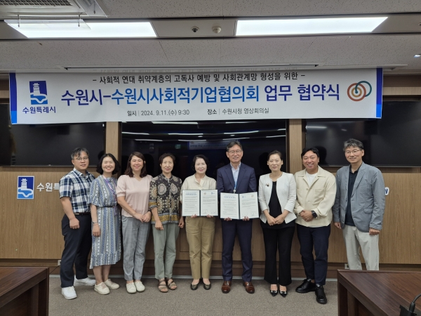 수원시와 수원시사회적기업협의회는 11일 시청 영상회의실에서 ‘사회적 연대 취약계층의 고립 예방을 위한 사회관계망 사업 업무협약’을 체결했다.