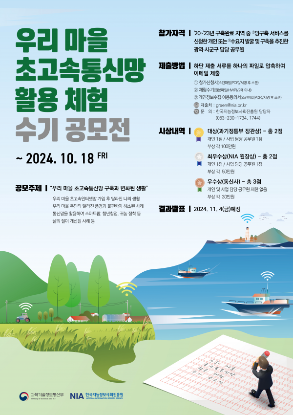 [금요저널] 과학기술정보통신부는 2020년부터 추진해 온 농어촌통신망 고도화 사업에 대한 성과를 기록하고 우수사례를 발굴하기 위한 체험수기를 10월 18일까지 공개 모집한다고 밝혔다.