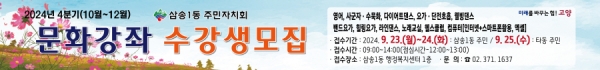 [금요저널] 고양특례시 덕양구 삼송1동 주민자치센터가 오는 9월 23일에서 25일까지 2024년 4분기 주민자치센터 문화강좌 프로그램 수강생을 모집한다고 밝혔다.