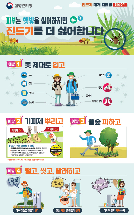 진드기 매개 감염병의 예방수칙으로는 △야외활동 전 진드기 기피제 사용하기 △피부 노출을 최소화할 수 있는 복장 갖춰입기 △귀가 즉시 옷은 털어 세탁하기 등이 있다.
