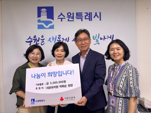 수원시 관계자는 “모두가 어려운 시기임에도 나눔을 실천해 주신 라온유치원 박휘순 원장님께 진심으로 감사드린다”며 “소중한 마음이 어려운 이웃들에게 전달되도록 하겠다”고 밝혔다.