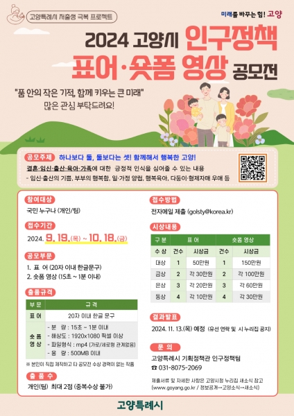 [금요저널] 고양특례시는 9월 19일부터 10월 18일까지 ‘고양특례시 저출생 극복 프로젝트’의 일환으로‘인구정책 표어·숏폼 영상 공모전’ 접수를 받는다고 밝혔다.