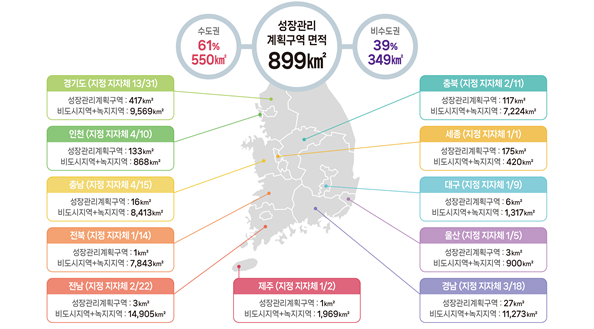 성장관리계획구역은 899㎢로 ’ 22년 436㎢ 대비 463㎢ 증가했으며 이 중 수도권에 550㎢가 지정됐다.