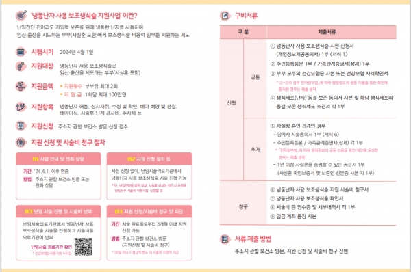 난임 진단을 받지 않은 부부가 지원받고자 하는 경우 난임지정 의료기관에서 시술을 종료한 후 3개월 이내 △냉동 난자 사용 보조생식술 지원신청서 △주민등록 등본 1부 △건강 보험 자격 확인서 1부 △생식세포 동결보존 동의서 사본 1부 △해당 생식세포 냉동·해동 방법을 적은 동결보존 생식세포 소견서 1부 △청구서 및 시술 확인서 △시술비 영수증 및 통장 사본 등을 관할 보건소에 제출해야 한다.