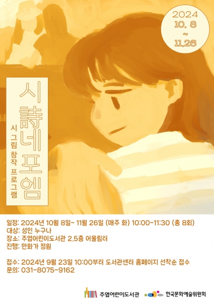 상주작가 시화 그리기 프로그램 ‘시네포엠’은 고양시에 거주하는 성인 15명을 대상으로 10월 8일부터 11월 26일까지 총 8회에 걸쳐 매주 화요일 10시부터 12시까지 진행한다.
