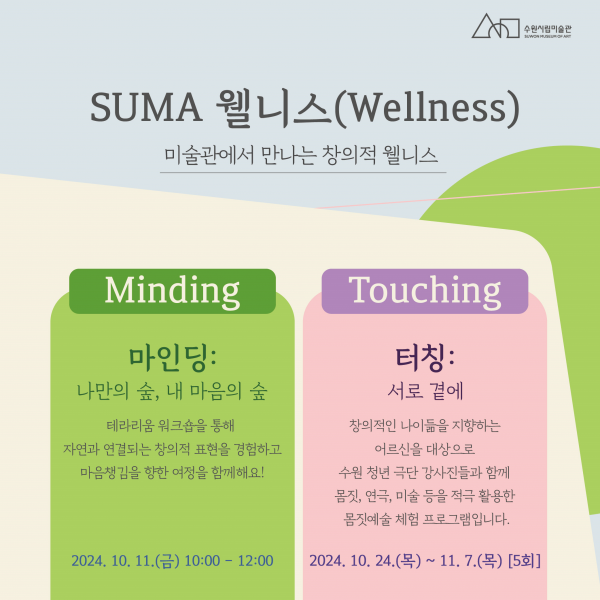 신규 프로그램인 ‘SUMA 웰니스’로 일반 성인을 대상으로 하는 ‘마인딩: 나만의 숲, 내 마음의 숲’과 지역 어르신 대상 ‘터칭: 서로 곁에’ 가 운영된다.