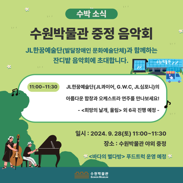 [금요저널] 수원박물관이 JL한꿈예술단과 함께 28일 수원박물관 야외 중정에서 음악회를 개최한다.