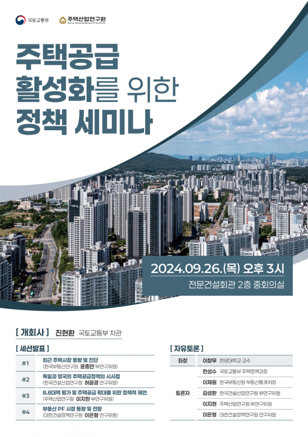 [금요저널] 국토교통부는 9월 26일 오후 3시 서울 전문건설회관에서 ‘주택공급 활성화를 위한 정책세미나’를 개최한다.