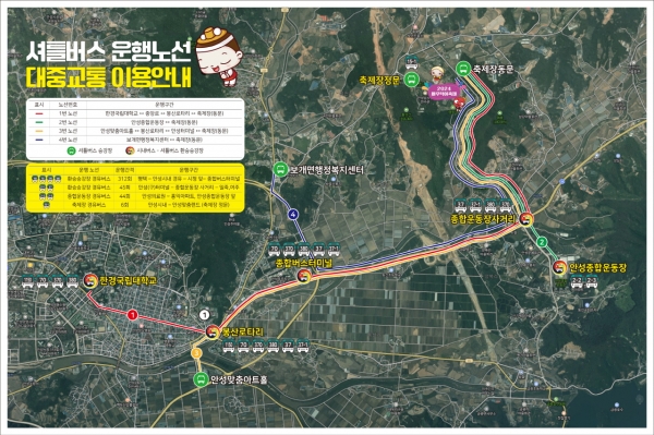 안성맞춤아트홀에서 출발하는 노선은 오전 9시 50분부터 오후 10시까지 1일 60회가 운영돼 봉산 로터리와 안성 터미널 등을 거쳐 축제장에 도착하며 안성맞춤 종합운동장에서 축제장으로 가는 노선은 오전 9시 50분부터 오후 10시까지 1일 120회가 운행된다.