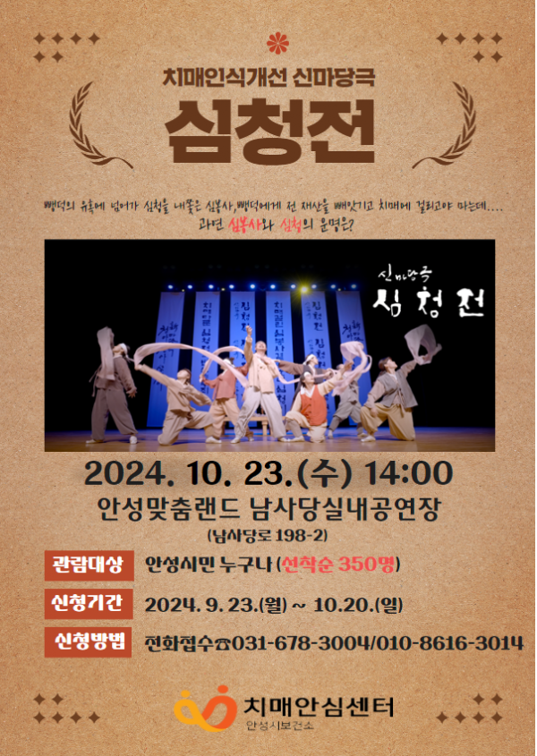 [금요저널] 안성시보건소 치매안심센터는 오는 10월 23일 오후 2시 치매에 대한 편견을 불식시켜 치매와 더불어 살아갈 수 있는 사회적 공감대 형성 및 치매 친화적 환경 조성의 일환으로 치매인식개선 “新마당극 심청전” 공연을 개최한다.