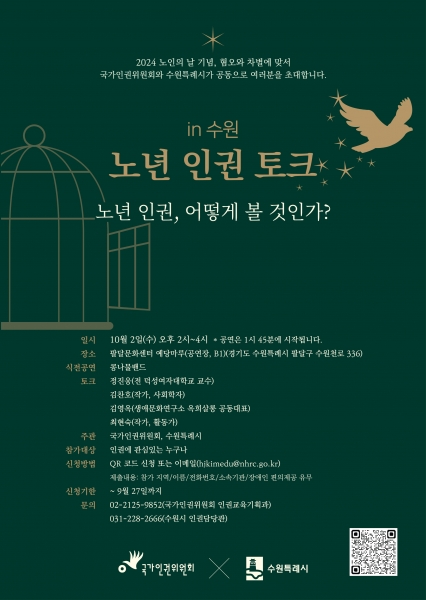 [금요저널] 수원시가 노인의 날을 기념해 10월 2일 오후 2시 팔달문화센터 예당마루에서 ‘노년×인권 토크콘서트’를 개최한다.